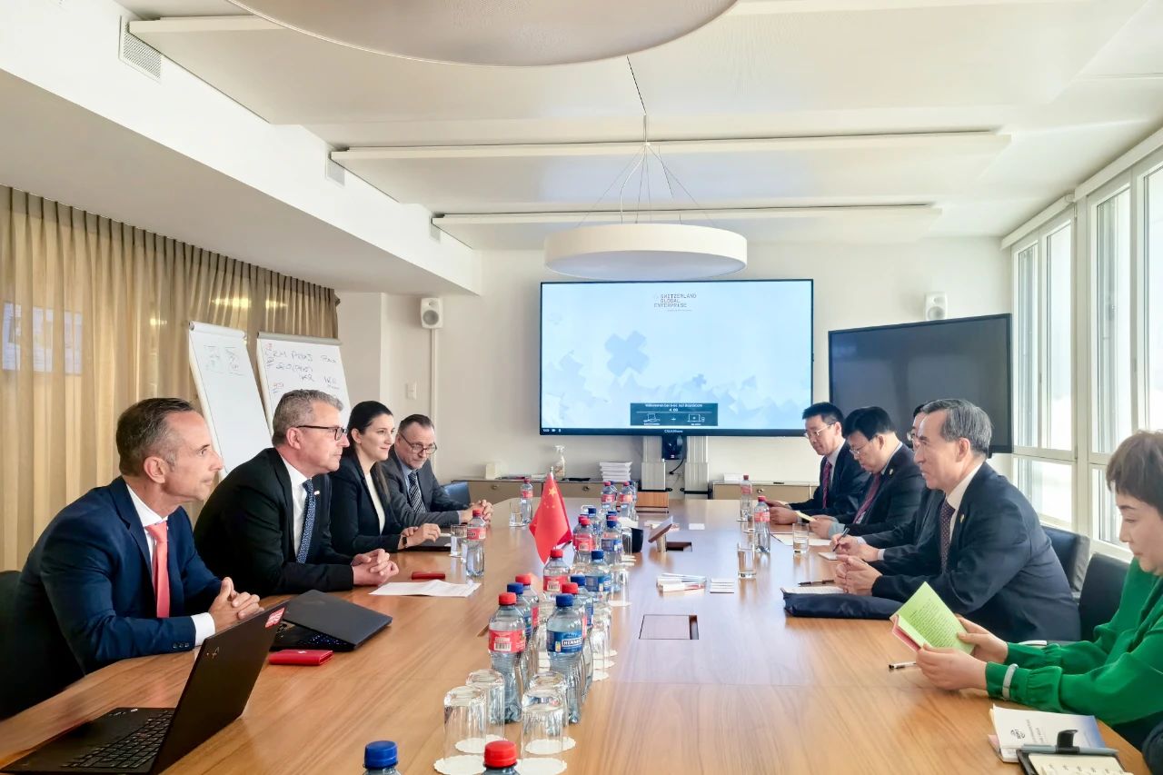 6月19日,中國(guó)貿(mào)促會(huì)會(huì)長(zhǎng)任鴻斌在瑞士蘇黎世會(huì)見瑞中經(jīng)濟(jì)協(xié)會(huì)主席魏希霆,雙方就在新發(fā)展階段持續(xù)深化兩機(jī)構(gòu)合作、推動(dòng)中瑞工商界交流互動(dòng)及鏈博會(huì)等議題進(jìn)行了友好交流。之后,任鴻斌還會(huì)見了瑞士貿(mào)易與投資署全球網(wǎng)絡(luò)與機(jī)構(gòu)關(guān)系總監(jiān)斯特凡·巴爾尼。