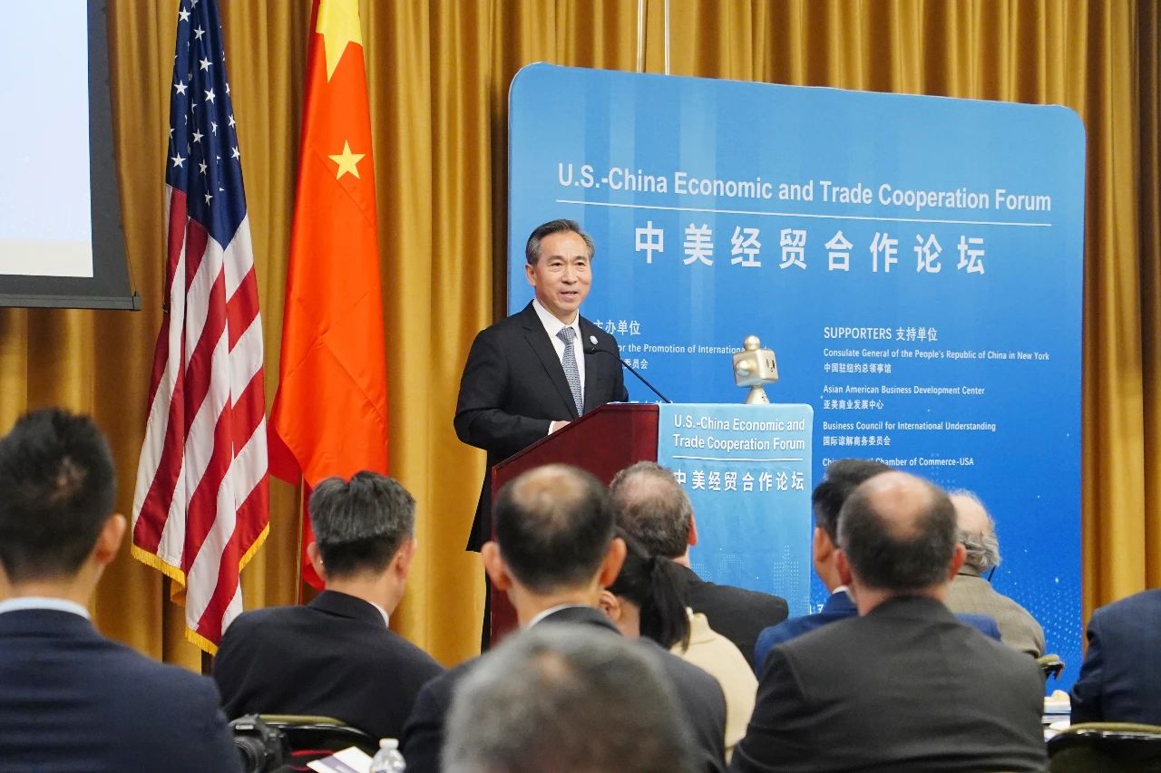 當地時間7月29日,在中國貿促會會長任鴻斌率中國企業家代表團訪問美國期間,中國—美國經貿合作論壇在紐約舉行。中國貿促會會長任鴻斌,中國駐紐約總領事館總領事黃屏,國際諒解商務委員會總裁兼首席執行官彼得·提察恩斯基,亞美商業發展中心總裁王章華,美國國際工商理事會首席執行官戴克蘭·達利,美國中國總商會會長、中國銀行美國地區行長胡威等出席并致辭,300余位中美企業及商協會代表出席。