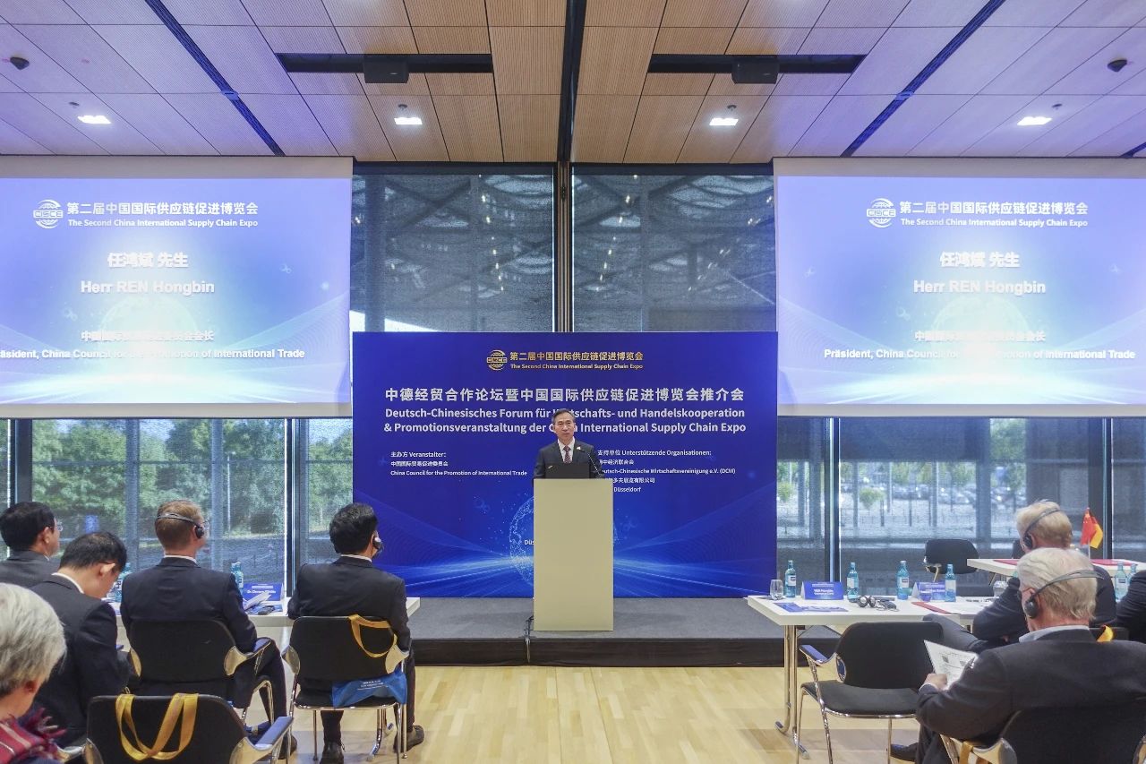 2024年9月11日,在中國貿促會會長任鴻斌率中國企業家代表團訪問德國期間,中德經貿合作論壇暨中國國際供應鏈促進博覽會推介會在杜塞爾多夫成功舉辦。中國貿促會會長任鴻斌,中國駐杜塞爾多夫總領事杜春國,杜塞爾多夫工商會主席、德中經濟聯合會顧問委員會主席施密茨等出席活動并致辭。