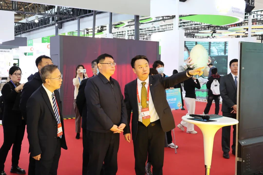 ▲11月28日,甘肅省委常委、副省長張錦剛(右一)一行參觀正大展館,正大集團農(nóng)牧食品企業(yè)中國區(qū)北京總部市場貿(mào)易部資深總裁張曙暉(右二)熱情接待來賓并介紹正大終端零售展臺。