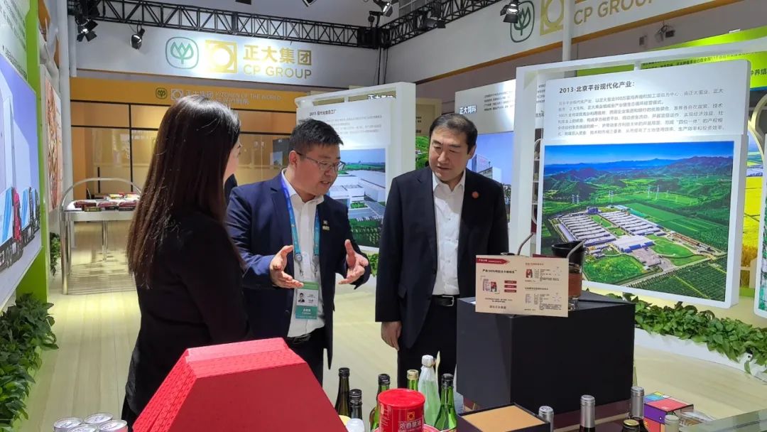 ▲12月2日,張少剛副會長(右一)一行參觀正大展館,正大集團農(nóng)牧食品企業(yè)中國區(qū)北京總部貿(mào)易部業(yè)務(wù)總監(jiān)馬立煌(右二)熱情接待來賓并介紹正大終端零售展臺。