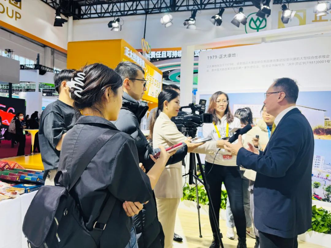 ▲展覽期間,張曙暉資深總裁在正大展館接受中央廣播電視總臺、新華社、中新社、人民網(wǎng)等媒體記者采訪。圖為張曙暉資深總裁接受媒體群訪。