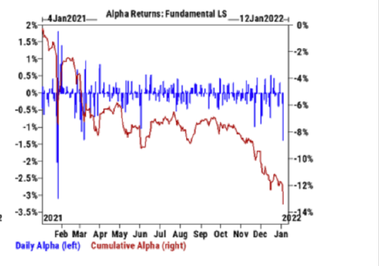 利率上升的幽靈促使交易員們重新思考他們長期以來對科技公司的喜愛。蜂擁離場給那些重倉投機性軟件股的對沖基金造成了麻煩,去年年底平倉部分頭寸之后,他們對這類股票的持倉仍處于高位。周二,高盛的多空基金客戶遭遇了一年來最慘的alpha回撤,即低于市場的回報。