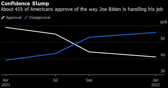 總體而言,1月的民調顯示,41%的成年人肯定拜登的工作表現,低于9月的44%和8月份的55%。